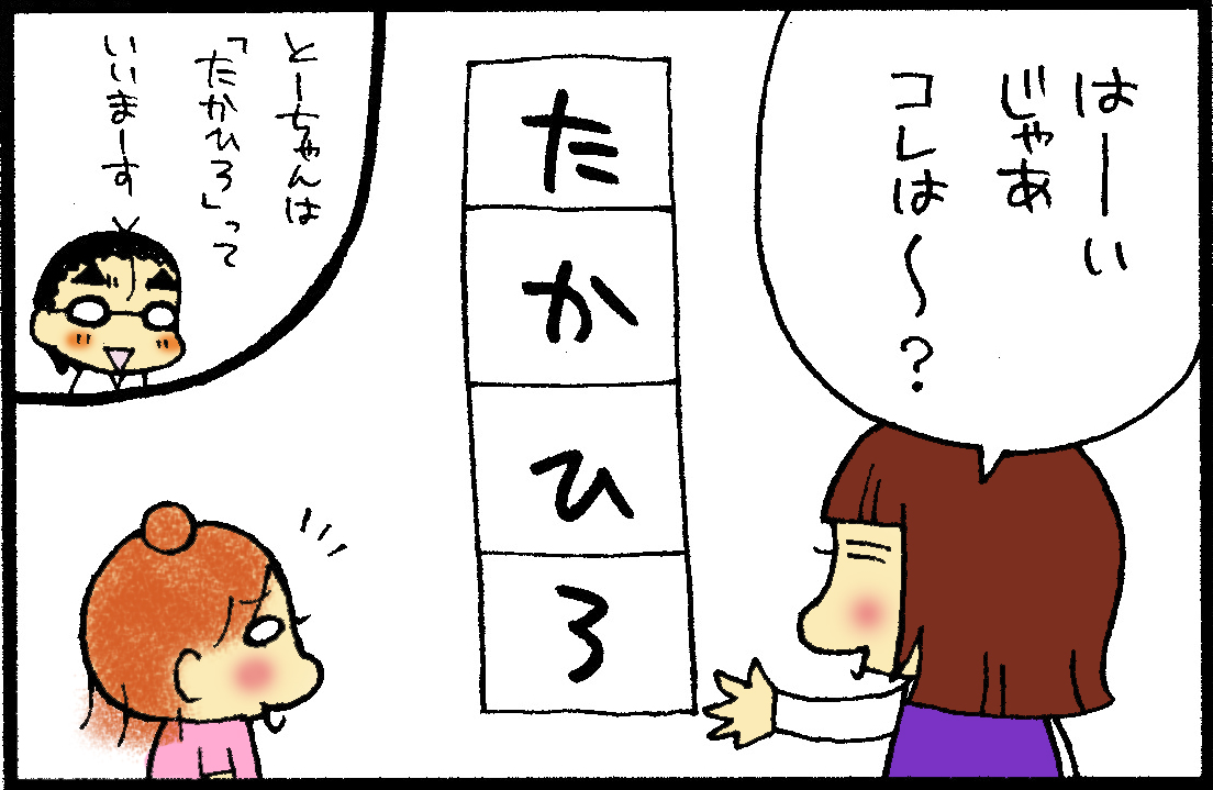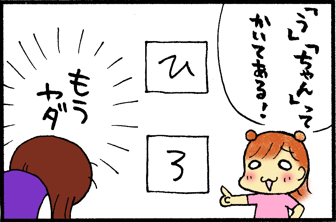 以前のブログでゆぅがひらがなチャレンジをしていることをマンガにしたら、自分の名前とか身近な人の名前から教えると良いと教えてもらって早速チャレンジ♪