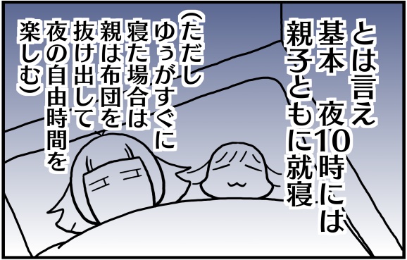寝かしつけする親側も、寝かしつけというよりも一緒に寝るつもりでお布団に入るので「早く寝てもらって、リビングに戻りたい!」という感じも無くなったし、運良くゆぅが先に寝ちゃえばお布団を抜け出して夜を楽しむことが出来るしで、良いリズムが作れたかな?と今のところは思っています。