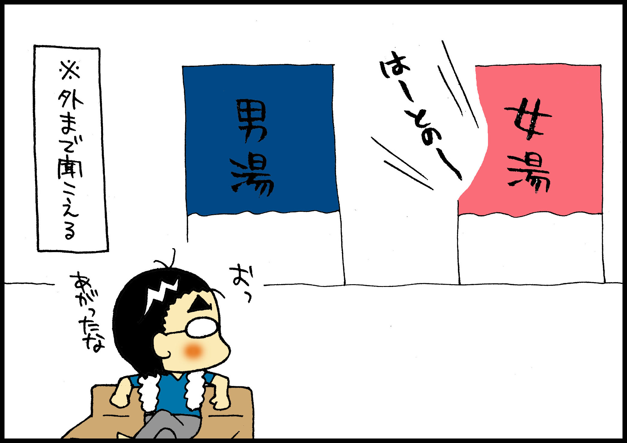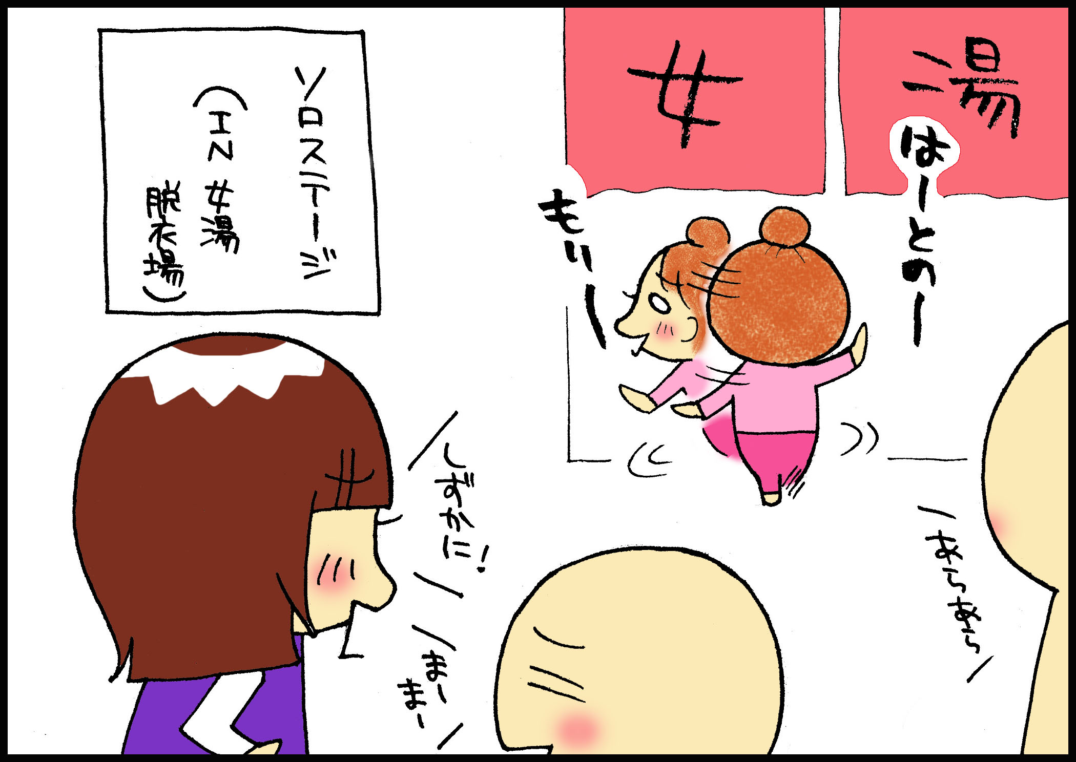 家ならいいけど、外だと結構迷惑なので止めさせたりするのですけど、温泉ではなぜか周りの皆さまが「止めなくていいわよー」「まぁまぁ」とか言われちゃいます