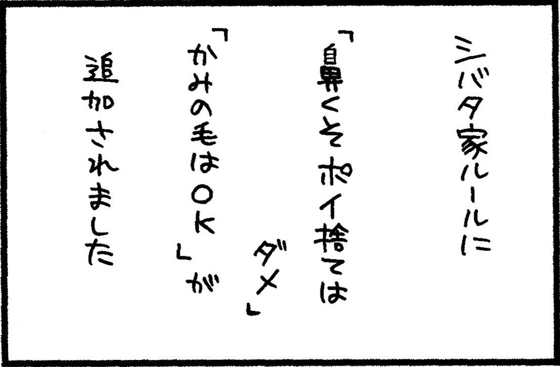 というわけで、我が家のルールとして「髪の毛はポイ捨てOK! 鼻くそはダメ!」というものが出来ました。