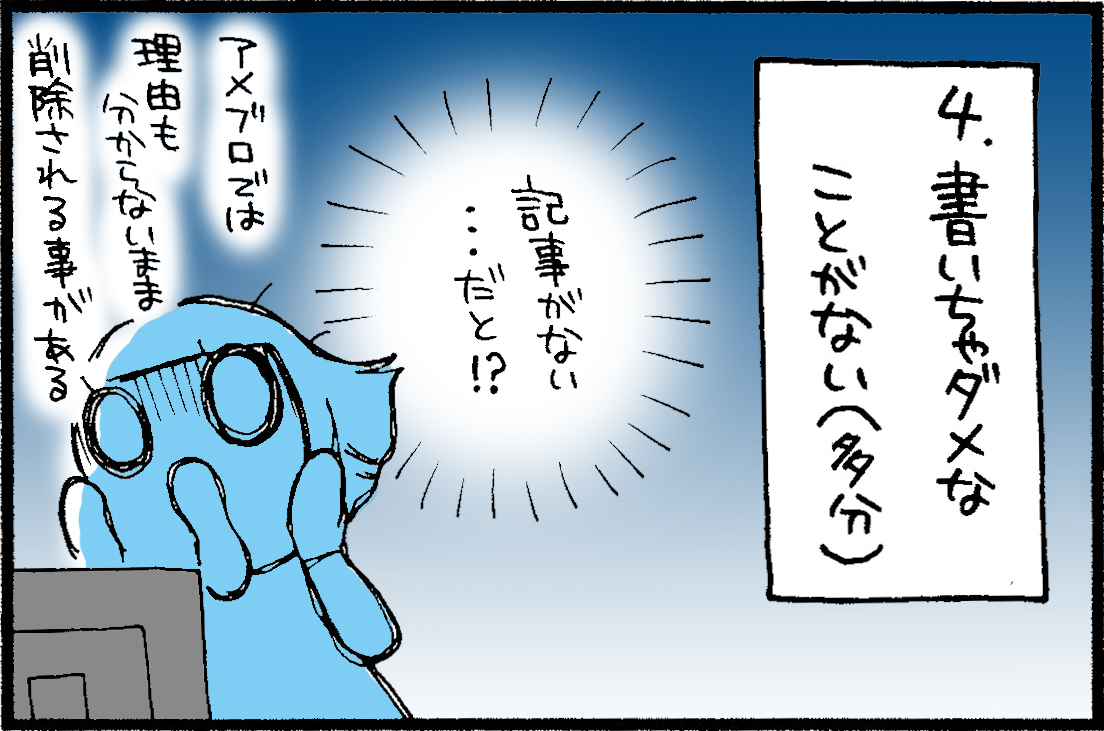 アメブロだと何がダメなのか今一つわからないけど、記事がまるまる表示されなくなっちゃうことがあります。