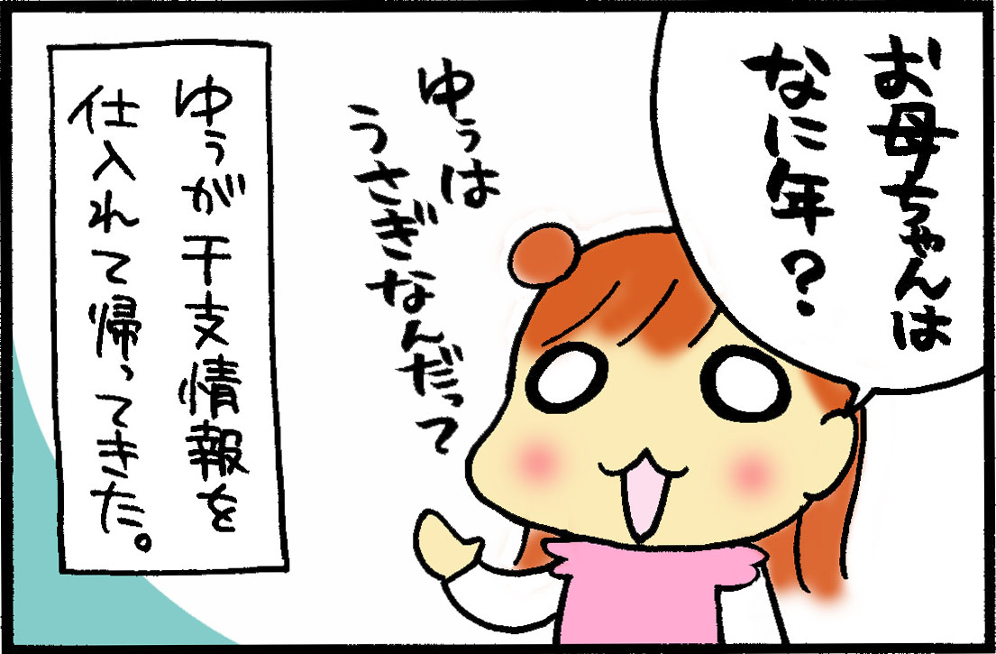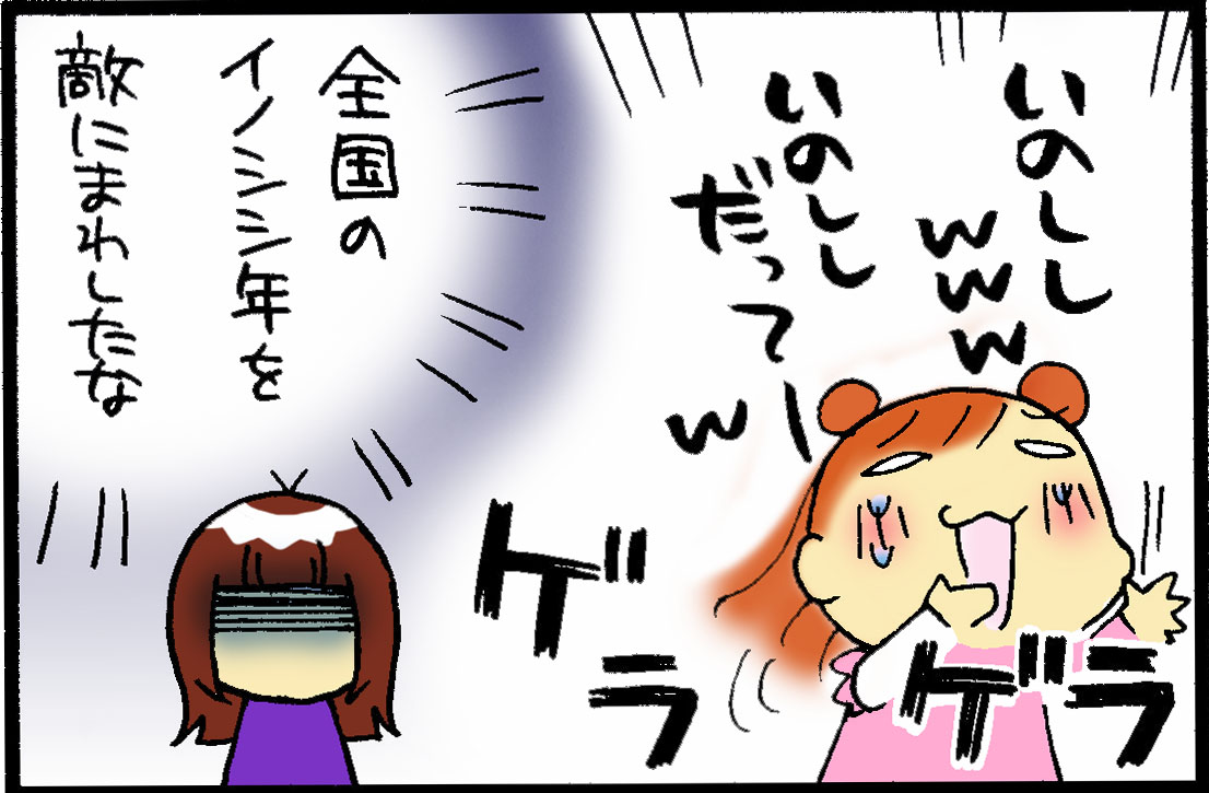 ゆぅがウサギで、父ちゃんが羊でここまでは普通に聞いてたくせに「イノシシ」と聞いた途端に笑い転げていました