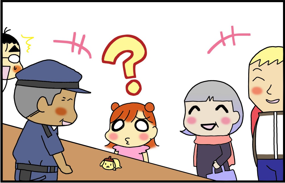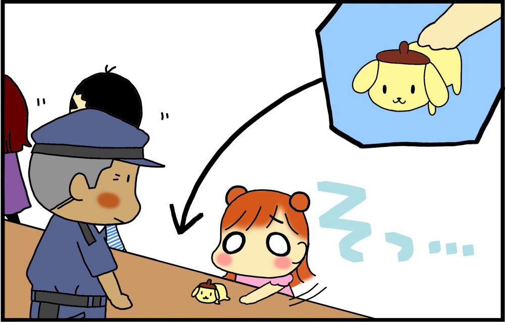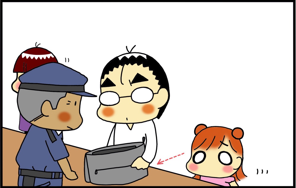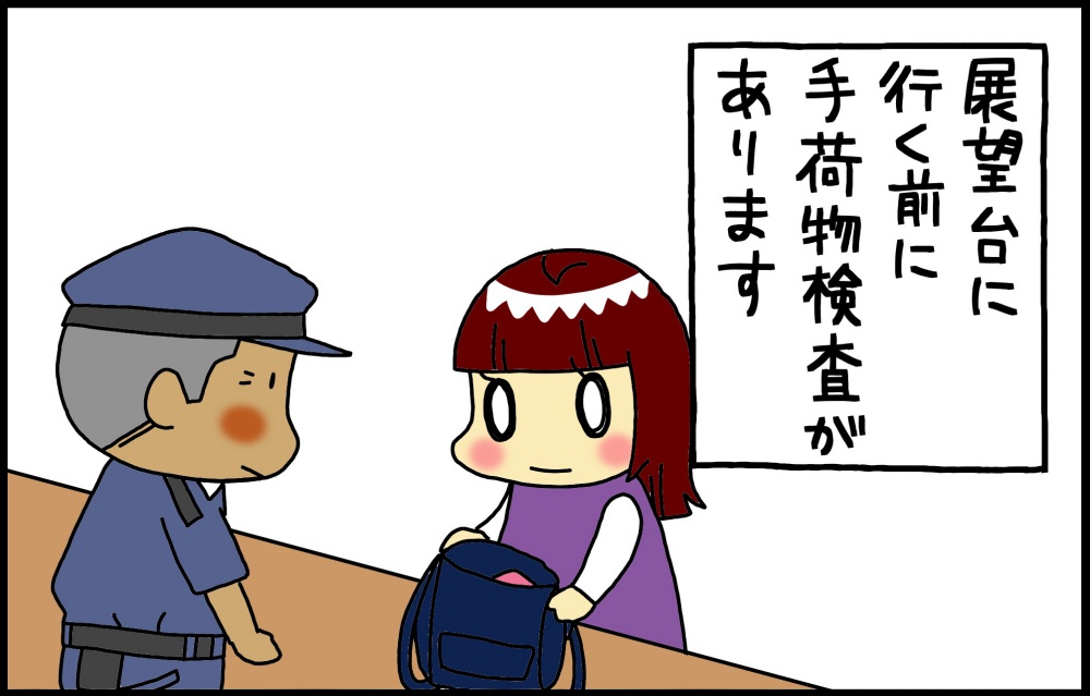 手荷物検査は空港でもしているけど、そのときはゆぅも自分用のバッグを持っていたので、それを見せてました。ところが、都庁展望台に行くときは手に持っているのがポムポムプリンだけ!! というわけで、ゆぅなり検査してもらう必要があると思ったみたい